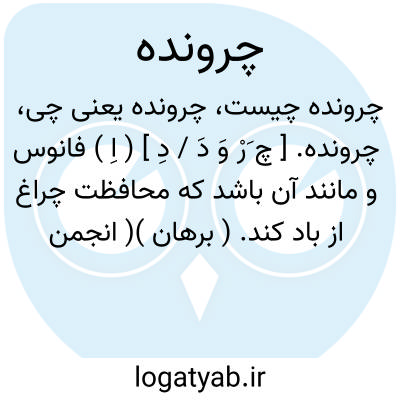 چرونده. [ چ َرْ وَ دَ / دِ ] ( اِ ) فانوس و مانند آن باشد که محافظت چراغ از باد کند. ( برهان )( انجمن آرا ) ( آنندراج ). چیزی که چراغ را در آن نهندتا باد او را فروننشاند. ( از جهانگیری ). قسمی از فانوس که چراغ را از باد و جز آن حفظ میکند. ( ناظم الاطباء ). مردنگی. چرغند. چرغنده. چروند. رجوع به چروند و چرغند و چرغنده شود. || چراغپایه را نیزگفته اند. ( برهان ). چراغپایه. ( انجمن آرا ) ( آنندراج )( ناظم الاطباء ). جای چراغ. چراغدان. چروند. چرغنده. رجوع به چرغند و چرغنده و چروند شود. || ( نف ) چاره جوینده. ( برهان ) ( انجمن آرا ) ( آنندراج ) ( ناظم الاطباء ). || بمعنی دونده و رونده هم آمده است. ( برهان ). بمعنی رونده در برهان آورده است، و چرویدن مصدر آن است. ( انجمن آرا ) ( آنندراج ). دونده و رونده. ( ناظم الاطباء ).