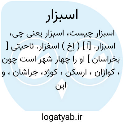 اسبزار. [اَ ] ( اِخ ) اسفزار. ناحیتی [ بخراسان ] او را چهار شهر است چون، کواژان، ارسکن، کوژد، جراشان، و این هرچهار اندر مقدار شش فرسنگ است. جائی بانعمت است و مردمان او خوارج اند و جنگی و در این ناحیت کوه بسیار است و استوار. ( حدود العالم ). رجوع به اسفزار شود.