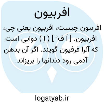 افربیون. [ اَ ف َ ] ( اِ ) دوایی است که آنرا فرفیون گویند. اگر آن بدهن آدمی رود دندانها را بریزاند. گزندگی جانوران را نافع است. ( برهان ) ( آنندراج ). صمغ سقزی دوایی که از سه قسم از گیاه طایفه ٔافوربیاسه اخذ میشود و از عوامل محرکه و مخرسه محسوب میگردد. و یک جزء از اجزاء مشمعهای منفظ میباشد. ( ناظم الاطباء ). در ناظم الاطباء بسکون حرف دوم ضبط شده است. فرفیو و فرسون و ابربیون نیز نامند و برومی افنین و بعربی آکل بنفشه و قاتل بنفشه و حافظالنخل و حافظالاطفال و کروش الغنم و بیونانی حالاس و تاکوب نیز و بمغربی بستانه گویند و اکثر لبن السودا نامند. ماهیت آن صمغی است خاکستری رنگ مایل بزردی با طعم و بوی تندو کهنه آن سرخ رنگ و نبات آن شبیه بنبات کاهو و کاسنی و شیردار و دو قسم می باشد قسمی برگ آن سفید و نبات آن پرشعبه و خارناک و قسمی برگ آن سیاه و خار آن تندتر و باریکتر و شیر آن بیشتر و منبت آن بلاد لینوز و حبش و سودان و بسبب تندی و حدت بوی شیر آن اهل آن بلاد از دور در زیر نبات آن شکنبه گوسفندی را پاک شسته در ظرفی تعبیه کرده میگذارند و از دور حربه ای مانند نیزه و غیر آن به آن میرسانند که شکافته گردد و دور میروند که بوی آن بمشامشان نرسد، بیکدفعه شیر بسیاری از آن فروریخته در شکنبه جمع میگردد و آنرا خشک کرده به اطراف میبرند. و رجوع به مخزن الادویه شود.