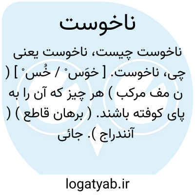 ناخوست. [ خوَس ْ / خُس ْ ] ( ن مف مرکب ) هر چیز که آن را به پای کوفته باشند. ( برهان قاطع ) ( آنندراج ). جائی که لگدکوب شده باشد. جائی که مسطح و برابر کرده شده باشد. ( ناظم الاطباء ). ناخوست، بضم خا و سکون واو و سین مهمله در سروری به معنی پای خوست به پای کوفته است، واغلب که این تصحیف باشد چه خوستن به معنی کوفتن است... و طرفه آنکه صاحب برهان ناخواست بر وزن ناراست به همین معنی آورده و ناخواستن ( ناخوستن ) مصدر این معنی تراشیده و این تصحیف نیست، قیامت است. عفی اﷲ تعالی عنه. «سراج اللغات بنقل فرهنگ نظام ج 5 ص ما». ناخوست، لغةً از: نا ( نفی، سلب ) + خوست = کوست، به معنی ناکوفته است. ( حاشیه ص 2091 برهان چ معین ). مصحف پاخوست ( پاخوسته، پایخست، پای خسته ). ( یادداشت لغت نامه ).
