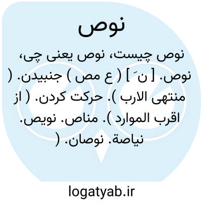 نوص. [ ن َ ] ( ع مص ) جنبیدن. ( منتهی الارب ). حرکت کردن. ( از اقرب الموارد ). مناص. نویص. نیاصة. نوصان. ( منتهی الارب ) ( اقرب الموارد ). نَوس. || آماده حرکت شدن. ( از اقرب الموارد ). مهیا شدن. ( از متن اللغة ). مناص. ( از متن اللغة ) ( از اقرب الموارد ). منیص. ( اقرب الموارد ). || برخاستن به سوی چیزی. مناص. ( از اقرب الموارد ). برخاستن و پناه بردن به کسی. ( از منتهی الارب ) ( از متن اللغة ). || جذب کردن چیزی را. ( از اقرب الموارد ). طلب کردن و به خود کشیدن چیزی را. ( از متن اللغة ). || گریختن. ( ترجمان علامه جرجانی ص 102 ) ( منتهی الارب ). بگریختن. ( تاج المصادر بیهقی ). فرار کردن و نجات یافتن. ( از اقرب الموارد ) ( از الاساس ). مناص. ( منتهی الارب ) ( اقرب الموارد ). منیص. ( اقرب الموارد ). || واپس شدن. ( تاج المصادر بیهقی ). بازپس شدن.. مناص. درنگ کردن. ( منتهی الارب ). عقب ماندن از چیزی. تأخر. ( از اقرب الموارد ). نیص. ( متن اللغة ). || یکسو گردیدن ازچیزی و خویشتن را بازکشیدن. ( منتهی الارب ). برگشتن وروی گرداندن از چیزی. ارتداد. ( از اقرب الموارد ). || ( اِ ) گورخر، بدان جهت که همیشه سر را بلند دارد همچو گریزنده و رمنده. ( منتهی الارب ) ( آنندراج ) ( از اقرب الموارد ). حمار وحشی. ( متن اللغة ). || سخاء. ( از اقرب الموارد ) ( از متن اللغة ).