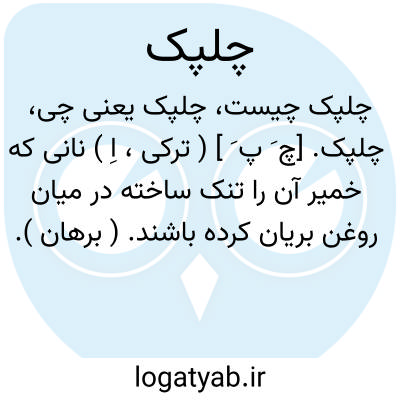 چلپک. [چ َ پ َ ] ( ترکی، اِ ) نانی که خمیر آن را تنک ساخته در میان روغن بریان کرده باشند. ( برهان ). نانی را گویند که در میان روغن بریان کنند و آن را چواک نیز خوانند. ( جهانگیری ). نانی که میان روغن بریان کنند و چواک و چربک نیز گویند. ( رشیدی ). نان تنک در میان روغن بریان کرده که آن را چربک نیز گویند و اصل همین است. ( انجمن آرا ). کنایه از نان تنک خمیری که در روغن بریان کنند و در مغلیه رواج دارد که در شب قدر یا در روز عید در خانه های همدیگر می فرستند و پزنده آن را چلپک پز نیز گویند. روغن جوشی ( در تداول اهالی خرسان ). ( از آنندراج ). مرادف چربک. ( از آنندراج ). قسمی از نان روغنی تنک. مرادف چلپل. ( ناظم الاطباء ):