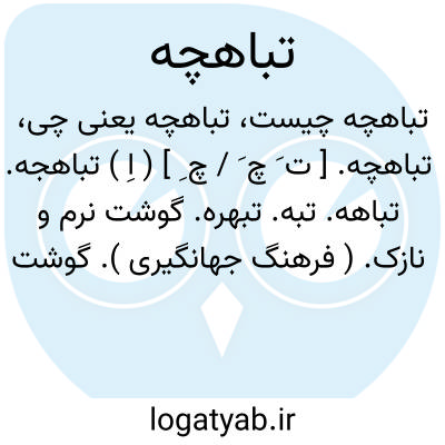 تباهچه. [ ت َ چ َ / چ ِ ] ( اِ ) تباهجه. تباهه. تبه. تبهره. گوشت نرم و نازک. ( فرهنگ جهانگیری ). گوشت پخته نرم و نازک را گویند، معرب آن طباهجه است. ( برهان ) ( آنندراج ). گوشت نازک شرحه شرحه برای کباب. ( فرهنگ نظام ). گوشت نرم و نازک قیمه کرده. ( ناظم الاطباء ). صاحب تاج العروس در ذیل طباهجه آرد: «... در بعضی نسخ تباهج بدون «ها» در آخر، گوشت شرحه شرحه و آن صفیف است و در تاج الاسماء معرب تباهه و در لسان ( لسان العرب ) «با»بدل است از بایی که بین «ب » و «ف » ( = پ ) باشد مانندبرند ( = پرند )... ( تاج العروس ج 2 ص 70 ). تباهه و تواهه و تباهچه و تبه و تبهره هر شش لغت بالفتح، گوشت نرم و نازک شرحه شرحه کرده، طباهجه معرب آن و بتازی چنین گوشت را کباب گویند. ( فرهنگ رشیدی ):