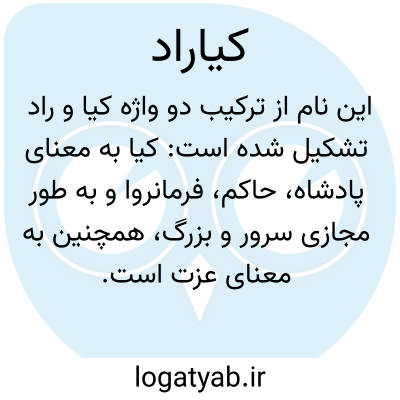 این نام از ترکیب دو واژه کیا و راد تشکیل شده است: کیا به معنای پادشاه، حاکم، فرمانروا و به طور مجازی سرور و بزرگ، همچنین به معنای عزت است و راد به معنای جوانمرد، آزاده، بخشنده، سخاوتمند، خردمند، دانا و حکیم می باشد. در واژه‌نامه آزاد، معنی اسم کیاراد به این صورت آمده است، پادشاه جوانمرد، که از ترکیب کیا به معنای سلطان و پادشاه و راد به معنای جوانمرد به وجود آمده است. این نام پسرانه با ریشه‌ای فارسی، تاکنون 4,167 بار در ایران ثبت شده است. از نظر آوایی، کیاراد خوش‌طنین و دلنشین به نظر می‌رسد و در میان نام‌های فارسی جایگاه ویژه‌ای دارد. رنگی که معمولاً به این نام نسبت داده می‌شود، نارنجی است که می‌تواند احساسات و معانی خاصی را به ذهن متبادر کند. تلفظ این نام در فارسی کیاراد و در انگلیسی به صورت /kiyā rād/ است و در نوشتار انگلیسی به شکل kiya rad نوشته می‌شود. تلفظ این نام ساده است و از نظر عددی نیز، در علم ابجد دارای ارزش خاصی است؛ عدد ابجدی آن 236، ابجد وسیط 32 و ابجد صغیر 11 می‌باشد.