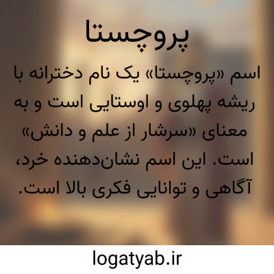 اسم «پروچستا» یک نام دخترانه با ریشه پهلوی و اوستایی است و به معنای «سرشار از علم و دانش» است. این اسم نشان‌دهنده خرد، آگاهی و توانایی فکری بالا است و بار معنایی مثبتی در فرهنگ ایرانی و اوستایی دارد.
