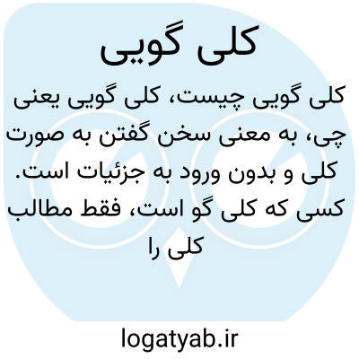 به معنی سخن گفتن به صورت کلی و بدون ورود به جزئیات است. کسی که کلی گو است، فقط مطالب کلی را بیان می‌کند و از ذکر جزئیات خودداری می‌کند.