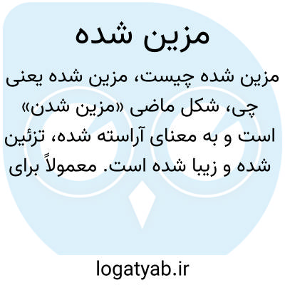 شکل ماضی «مزین شدن» است و به معنای آراسته شده، تزئین شده و زیبا شده است. معمولاً برای اشاره به اشیا، مکان‌ها یا حتی شخصیت‌ها به کار می‌رود که به وسیله عناصر زیبا یا ارزشمند مزین گردیده‌اند.