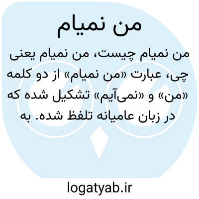 عبارت «من نمیام» از دو کلمه «من» و «نمیآیم» تشکیل شده که در زبان عامیانه تلفظ شده. به معنی «من نمیآیم» است، یعنی فرد اعلام میکند که قصد حضور یا رفتن به جایی را ندارد.
