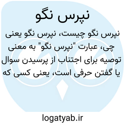 عبارت "نپرس نگو" به معنی توصیه برای اجتناب از پرسیدن سوال یا گفتن حرفی است، یعنی کسی که میخواهد از صحبت یا کنجکاوی جلوگیری کند این عبارت را به کار میبرد. معمولاً به صورت اصطلاحی برای نشان دادن سکوت یا جلوگیری از پیشامد نامطلوب استفاده میشود.