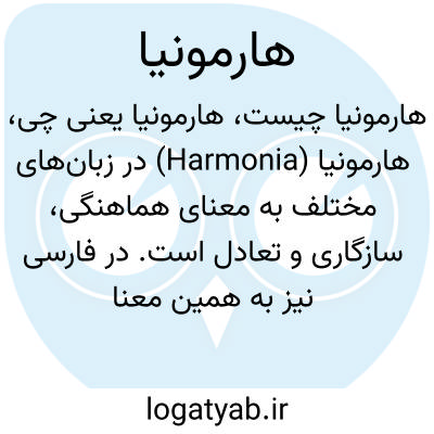 هارمونیا (Harmonia) در زبانهای مختلف به معنای هماهنگی، سازگاری و تعادل است. در فارسی نیز به همین معنا به کار میرود و میتواند اشاره به هماهنگی اجزاء یا عوامل مختلف در یک سیستم باشد. همچنین هارمونیا نامی در اساطیر یونانی است که نماد هماهنگی و وحدت است.