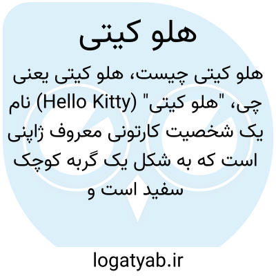 "هلو کیتی" (Hello Kitty) نام یک شخصیت کارتونی معروف ژاپنی است که به شکل یک گربه کوچک سفید است و در فرهنگ پاپ و محصولات کودکان بسیار محبوب است. این نام به فارسی به همین صورت استفاده می‌شود و معنی لغوی خاصی ندارد.