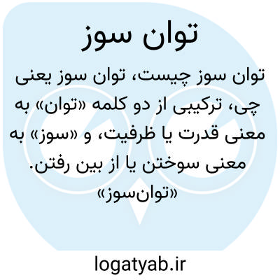 ترکیبی از دو کلمه «توان» به معنی قدرت یا ظرفیت، و «سوز» به معنی سوختن یا از بین رفتن. «توانسوز» میتواند به معنای از بین رفتن توان یا سوختن انرژی باشد، مثلاً هنگامی که نیروی فیزیکی یا روانی به شدت کاهش مییابد.