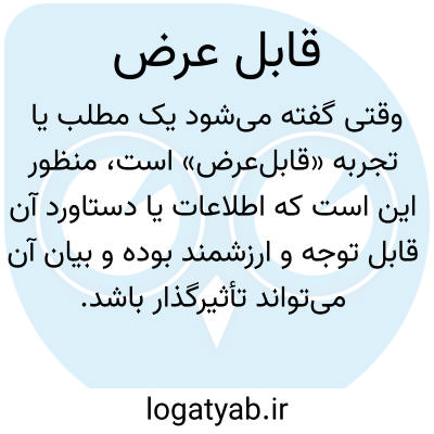 وقتی گفته می‌شود یک مطلب یا تجربه «قابل‌عرض» است، منظور این است که اطلاعات یا دستاورد آن قابل توجه و ارزشمند بوده و بیان آن می‌تواند تأثیرگذار باشد. این واژه معمولاً در مکالمات رسمی، گزارش‌ها یا شرح موفقیت‌ها استفاده می‌شود تا اهمیت موضوع برجسته شود.