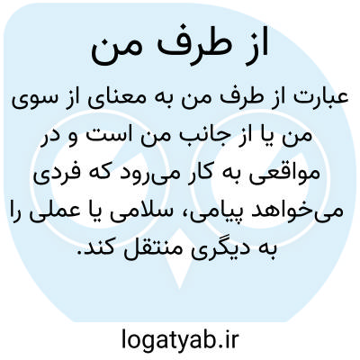 عبارت از طرف من به معنای از سوی من یا از جانب من است و در مواقعی به کار میرود که فردی میخواهد پیامی، سلامی یا عملی را به دیگری منتقل کند. این عبارت نشاندهنده این است که فردی به نمایندگی از شخص دیگری عمل میکند یا پیامی را به کسی میرساند.