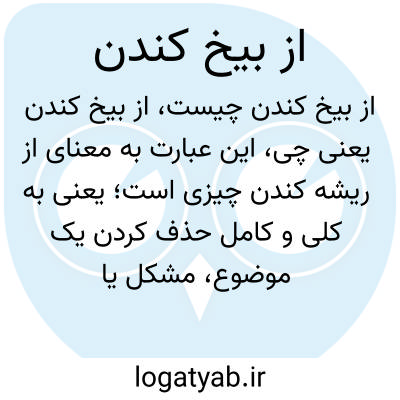 این عبارت به معنای از ریشه کندن چیزی است؛ یعنی به کلی و کامل حذف کردن یک موضوع، مشکل یا نگرانی. مثلاً «از بیخ کندن یک مشکل» یعنی آن مشکل را کاملاً برطرف کردن.