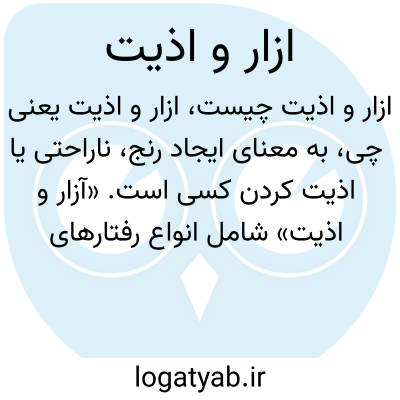 به معنای ایجاد رنج، ناراحتی یا اذیت کردن کسی است. «آزار و اذیت» شامل انواع رفتارهای توهین‌آمیز، شکنجه، ظلم، تحقیر و دیگر اشکال آزار جسمی و روانی است که باعث ناراحتی یا آسیب به فرد می‌شود.