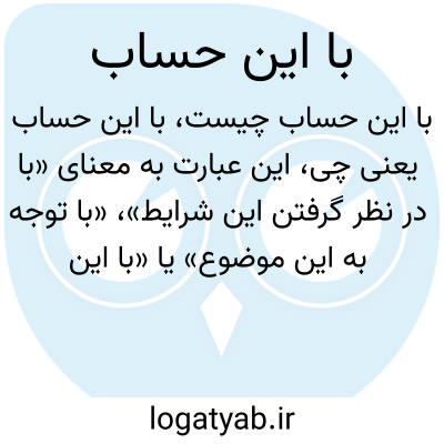 این عبارت به معنای «با در نظر گرفتن این شرایط»، «با توجه به این موضوع» یا «با این محاسبه» است. زمانی استفاده میشود که بخواهیم نتیجهگیری یا جمع بندی بر اساس اطلاعاتی ارائه دهیم. مثلاً: «با این حساب، بهتر است فعلا صبر کنیم.»