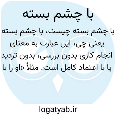 این عبارت به معنای انجام کاری بدون بررسی، بدون تردید یا با اعتماد کامل است. مثلاً «او را با چشم بسته قبول کردم» یعنی بدون شک یا تردید به او اعتماد کردم.