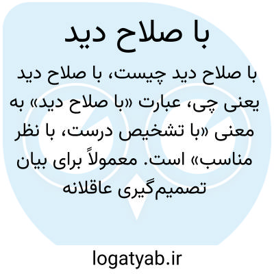 عبارت «با صلاح دید» به معنی «با تشخیص درست، با نظر مناسب» است. معمولاً برای بیان تصمیم‌گیری عاقلانه یا پس از بررسی شرایط استفاده می‌شود. مثلاً: «با صلاح دید مدیر، جلسه به تعویق افتاد.»