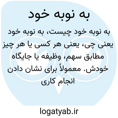 یعنی هر کسی یا هر چیز مطابق سهم، وظیفه یا جایگاه خودش. معمولاً برای نشان دادن انجام کاری توسط هر فرد یا بخش به صورت جداگانه اشاره میکند، مثلاً: «هر عضو به نوبه خود مسئول است.»
