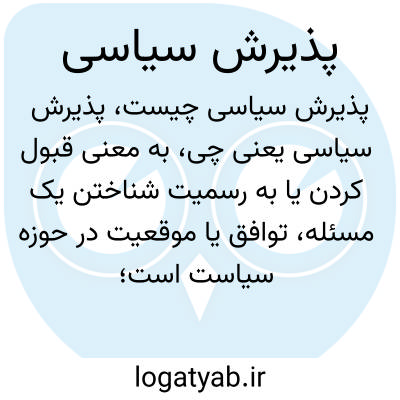 به معنی قبول کردن یا به رسمیت شناختن یک مسئله، توافق یا موقعیت در حوزه سیاست است؛ مثلاً پذیرش یک نظام، قانون یا سیاست مشخص توسط گروه‌ها یا کشورها.