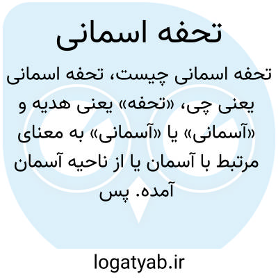 «تحفه» یعنی هدیه و «آسمانی» یا «آسمانی» به معنای مرتبط با آسمان یا از ناحیه آسمان آمده. پس «تحفه آسمانی» به معنای هدیه‌ای از سوی آسمان یا یک نعمت الهی است که معمولاً به چیز مقدس یا با ارزش اشاره دارد.