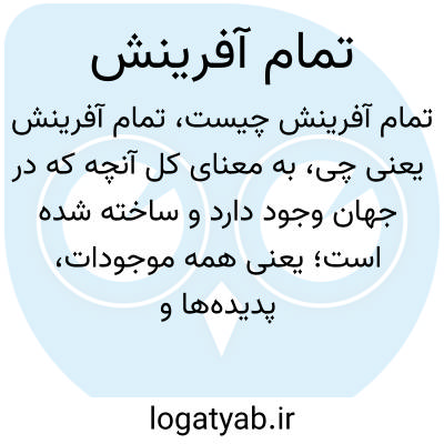 به معنای کل آنچه که در جهان وجود دارد و ساخته شده است؛ یعنی همه موجودات، پدیده‌ها و اجزای کیهان در مجموع به عنوان “تمام آفرینش” شناخته می‌شوند.