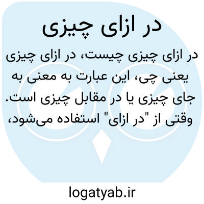 این عبارت به معنی به جای چیزی یا در مقابل چیزی است. وقتی از "در ازای" استفاده میشود، منظور آن است که یک عمل یا چیز به طور جبرانی یا معاوضهای به جای چیز دیگر انجام شده یا دریافت شده است.