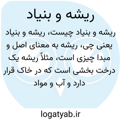 ریشه به معنای اصل و مبدا چیزی است، مثلاً ریشه یک درخت بخشی است که در خاک قرار دارد و آب و مواد مغذی را جذب می‌کند. بنیاد به معنای پایه و اساس هر سازه یا موضوعی است که بر آن استوار است، مانند بنیاد یک ساختمان یا بنیاد یک نظریه.