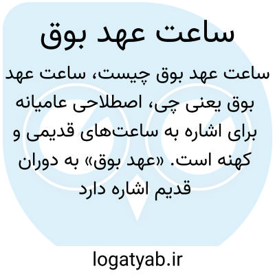 اصطلاحی عامیانه برای اشاره به ساعتهای قدیمی و کهنه است. «عهد بوق» به دوران قدیم اشاره دارد و در کنار «ساعت» معنای ساعتی بسیار قدیمی یا از رده خارج را میرساند.