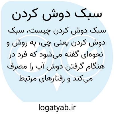 به روش و نحوه‌ای گفته می‌شود که فرد در هنگام گرفتن دوش آب را مصرف می‌کند و رفتارهای مرتبط با سرعت، دمای آب و مدت زمان دوش گرفتن را شامل می‌شود. سبک دوش کردن می‌تواند نشان‌دهنده عادات فردی در بهداشت شخصی باشد.