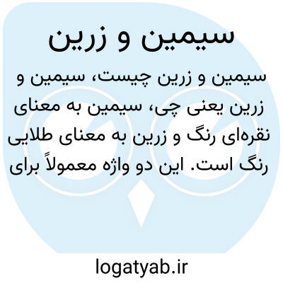 سیمین به معنای نقرهای رنگ و زرین به معنای طلایی رنگ است. این دو واژه معمولاً برای توصیف رنگ یا زیبایی به کار میروند و میتوانند نامهای شخصی نیز باشند.