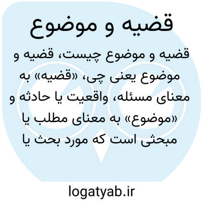 «قضیه» به معنای مسئله، واقعیت یا حادثه و «موضوع» به معنای مطلب یا مبحثی است که مورد بحث یا بررسی قرار میگیرد. هر دو واژه بار معنایی مربوط به بحث و تحلیل دارند.