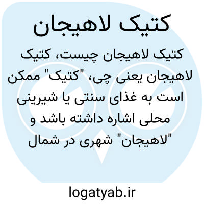 "کتیک" ممکن است به غذای سنتی یا شیرینی محلی اشاره داشته باشد و "لاهیجان" شهری در شمال ایران است. بنابراین "کتیک لاهیجان" احتمالاً نوعی غذای محلی یا شیرینی خاص منطقه لاهیجان است که نشاندهنده فرهنگ غذایی این منطقه میباشد.