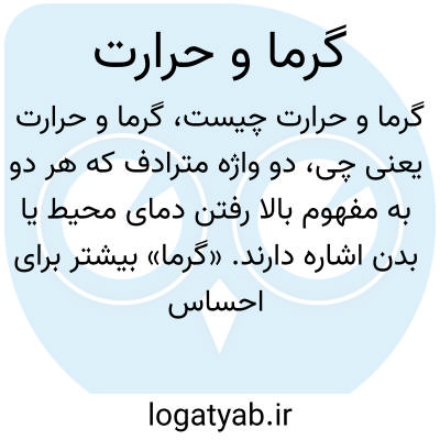 دو واژه مترادف که هر دو به مفهوم بالا رفتن دمای محیط یا بدن اشاره دارند. «گرما» بیشتر برای احساس دمای بالا و محیط گرم به کار می‌رود و «حرارت» معنی علمی‌تری دارد و به دمای جسم یا انرژی گرمایی گفته می‌شود. هر دو برای توصیف دمای زیاد کاربرد دارند.