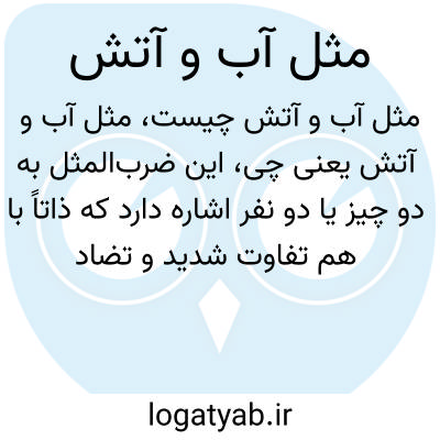 این ضربالمثل به دو چیز یا دو نفر اشاره دارد که ذاتاً با هم تفاوت شدید و تضاد دارند، درست مانند آب و آتش که با هم همخوانی ندارند و نمیتوانند با هم همزیستی کنند.