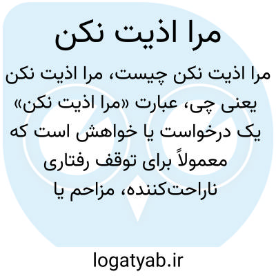 عبارت «مرا اذیت نکن» یک درخواست یا خواهش است که معمولاً برای توقف رفتاری ناراحتکننده، مزاحم یا آزاردهنده به کار میرود و به معنای جلوگیری از ایجاد رنجش و ناراحتی است.