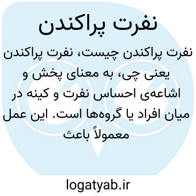 به معنای پخش و اشاعهی احساس نفرت و کینه در میان افراد یا گروهها است. این عمل معمولاً باعث تفرقه و اختلاف میان انسانها شده و فضایی منفی و خصمانه ایجاد میکند. نفرت پراکندن معمولاً در سیاست، رسانهها یا محیطهای اجتماعی نامطلوب به کار میرود.