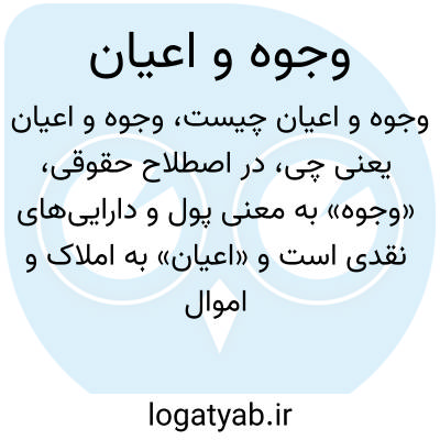 در اصطلاح حقوقی، «وجوه» به معنی پول و دارایی‌های نقدی است و «اعیان» به املاک و اموال غیرنقدی مانند زمین، ساختمان و اشیاء با ارزش گفته می‌شود. پس «وجوه و اعیان» مجموع دارایی‌های نقدی و غیرنقدی را شامل می‌شود.