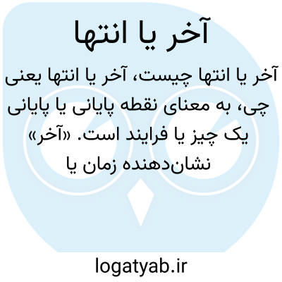 به معنای نقطه پایانی یا پایانی یک چیز یا فرایند است. «آخر» نشاندهنده زمان یا مکانی است که چیزی به پایان میرسد یا تمام میشود. این کلمه میتواند به معنای پایان یک رویداد، مسیر، داستان یا زمان نیز کاربرد داشته باشد.