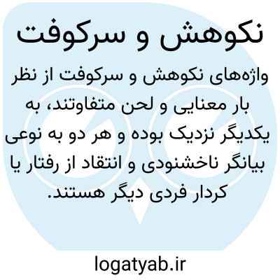 واژه‌های نکوهش و سرکوفت در زبان فارسی، اگرچه از نظر بار معنایی و لحن متفاوتند، اما در مفهوم کلی به یکدیگر نزدیک بوده و هر دو به نوعی بیانگر ناخشنودی و انتقاد از رفتار یا کردار فردی دیگر هستند. نکوهش به معنای سرزنش، ملامت، توبیخ و انتقاد است و معمولاً به صورت کلی‌تری برای بیان نارضایتی از یک عمل یا رفتار به کار می‌رود. این واژه بار رسمی‌تری دارد و در متون ادبی و رسمی بیشتر مورد استفاده قرار می‌گیرد. سرکوفت نیز در همین راستا، به معنای سرزنش کردن و ملامت نمودن است، با این تفاوت که لحنی عامیانه‌تر و شاید کمی تندتر دارد. این واژه بیشتر در محاورات روزمره و برای بیان سرزنش شدیدتر به کار می‌رود و معادل فارسی و رایج‌تری برای نکوهش به شمار می‌رود. در واقع، هر دو واژه در پی اصلاح رفتار و جلوگیری از تکرار اشتباهات هستند، اما با رویکرد و لحنی متفاوت.