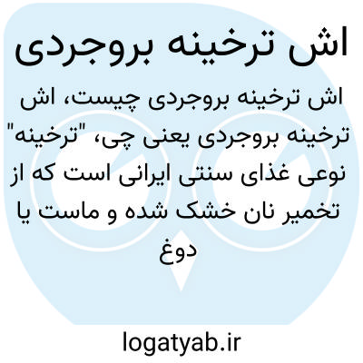 "ترخینه" نوعی غذای سنتی ایرانی است که از تخمیر نان خشک شده و ماست یا دوغ تشکیل شده است. "اش" در اینجا به معنای نوعی سوپ یا خوراک است. این عبارت به نوعی آش ترخینه محلی شهر بروجرد اشاره دارد.