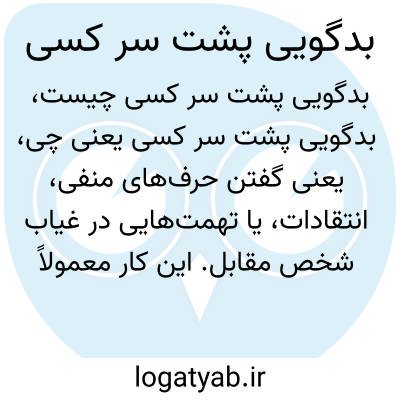 یعنی گفتن حرفهای منفی، انتقادات، یا تهمتهایی در غیاب شخص مقابل. این کار معمولاً نشانهی عدم صداقت و خیانت به اعتماد است و در فرهنگهای مختلف مذموم شمرده میشود.