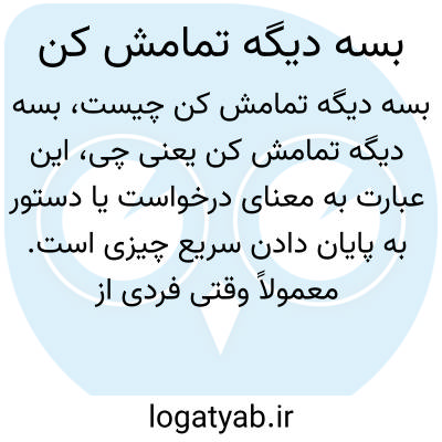 این عبارت به معنای درخواست یا دستور به پایان دادن سریع چیزی است. معمولاً وقتی فردی از ادامه یک رفتار یا صحبت خسته شده یا ناراحت است، می‌گوید "بسه دیگه تمامش کن" یعنی می‌خواهد طرف مقابل موضوع را خاتمه دهد.