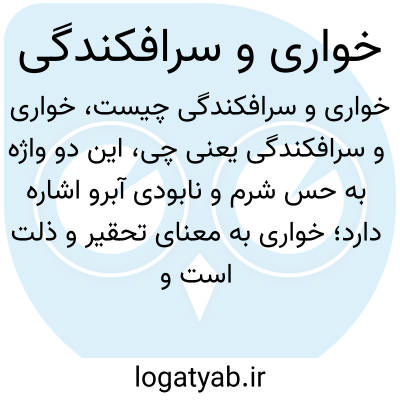 این دو واژه به حس شرم و نابودی آبرو اشاره دارد؛ خواری به معنای تحقیر و ذلت است و سرافکندگی نیز به وضعیت سر پایین و شرمنده بودن گفته میشود که هر دو مربوط به تجربه احساس شکستخوردگی و خجالت در جامعه یا بین فردی میباشند.
