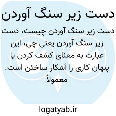 این عبارت به معنای کشف کردن یا پنهان کاری را آشکار ساختن است. معمولاً وقتی گفته میشود کسی "دست زیر سنگ آورده"، یعنی راز یا حقیقتی را یافته یا فاش کرده است.