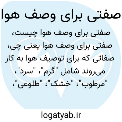صفاتی که برای توصیف هوا به کار میروند شامل "گرم"، "سرد"، "مرطوب"، "خشک"، "طلوعی"، "ابری" و "بادخیز" هستند. این صفات کیفیت و حالت جوی در یک زمان خاص را نشان میدهند.