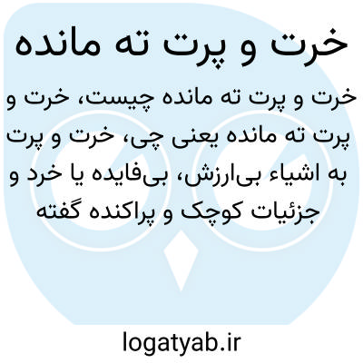 خرت و پرت به اشیاء بیارزش، بیفایده یا خرد و جزئیات کوچک و پراکنده گفته میشود. "خرت و پرت ته مانده" به معنای اشیاء یا وسایل کهنه، کمارزش یا به جای مانده از چیزهای دیگر است، چیزی که معمولا قابل استفاده نیست.