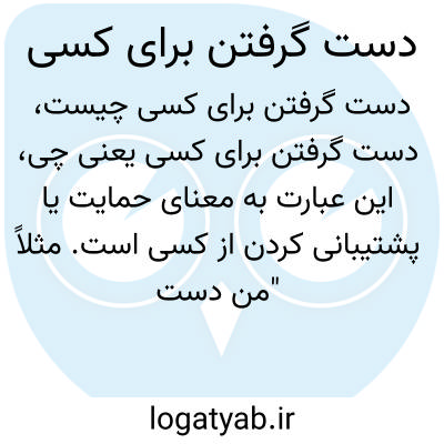 این عبارت به معنای حمایت یا پشتیبانی کردن از کسی است. مثلاً "من دست گرفتم برای دوستم" یعنی به او کمک یا یاری دادهام تا کاری را انجام دهد یا مشکلی را حل کند.