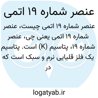 عنصر شماره ۱۹، پتاسیم (K) است. پتاسیم یک فلز قلیایی نرم و سبک است که در طبیعت به صورت ترکیبی یافت می‌شود. پتاسیم نقش بسیار مهمی در عملکرد سلول‌های زنده دارد، به ویژه در سیستم عصبی و ماهیچه‌ها، و همچنین در کشاورزی به عنوان کود مورد استفاده قرار می‌گیرد.